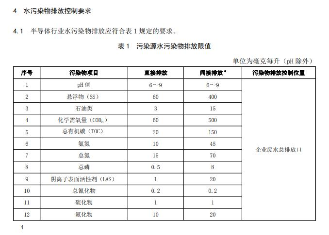 本文件规定了半导体行业水污染物排放控制要求、大气污染物排放控制要求、污染物监测要求、达标判定要求、实施与监督等内容。本文件适用于半导体行业现有企业水和大气污染物排放管理,以及新建企业环境影响评价、环境保护设施设计、竣工环境保护验收、排污许可证核发及其投产后的水和大气污染物排放管理。